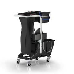 3P COMPACT — новая компактная многофункциональная тележка для сбора мусора и мытья полов и поверхностей. Тележка оснащена простой в сборке окрашенной металлической ручкой, двумя вращающимися опорами с двумя 6-литровыми ведрами, поломоечной машиной New-Line и опорным поддоном.